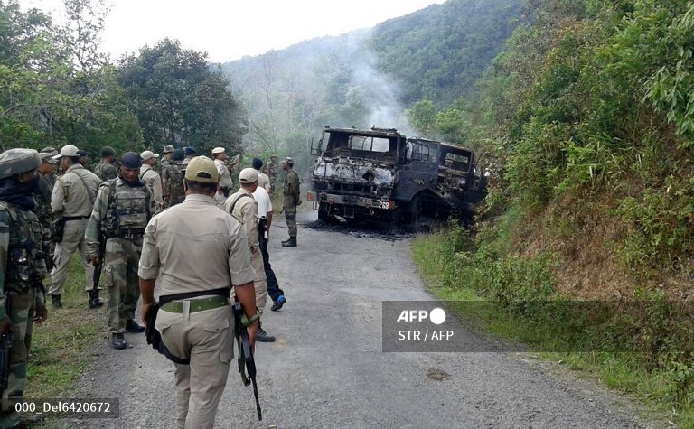 In this photograph taken on June 4, 2015, Indian security personnel stand alongside the smouldering vehicle wreckage at the scene of an attack on a military convoy in a remote area of Chandel district, about 120 kilometres (75 miles) southwest of northeastern Manipur's state capital Imphal. Heavily armed rebels in India's restive northeast killed at least 20 troops on June 4, police said, in one of the area's worst such attacks in years. AFP PHOTO STR / AFP