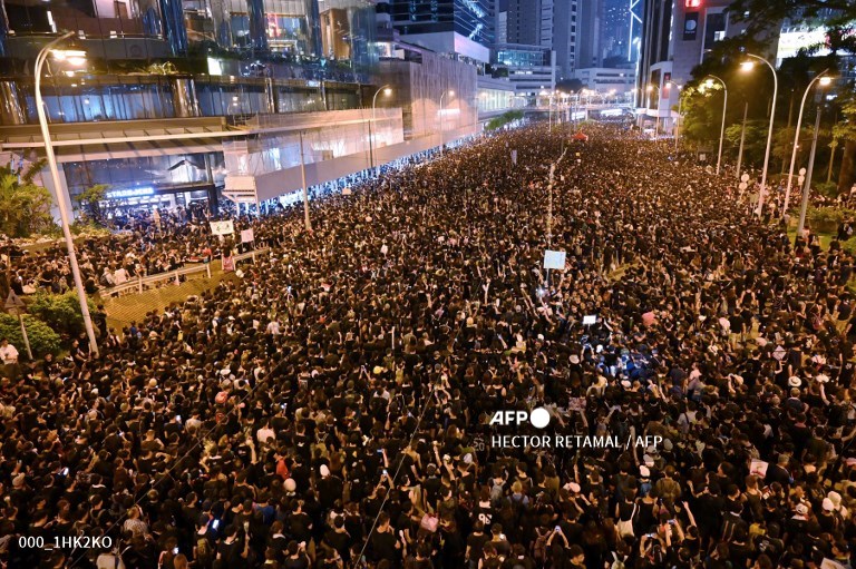 Thousands of protesters dressed in black take part in a rally against a controversial extradition law proposal in Hong Kong on June 16, 2019. Hundreds of thousands of protesters choked Hong Kong's streets for a second straight on June 16 in a defiant rebuke of a reviled extradition law, piling pressure on the city's embattled pro-Beijing leader despite a weekend climbdown.HECTOR RETAMAL / AFP