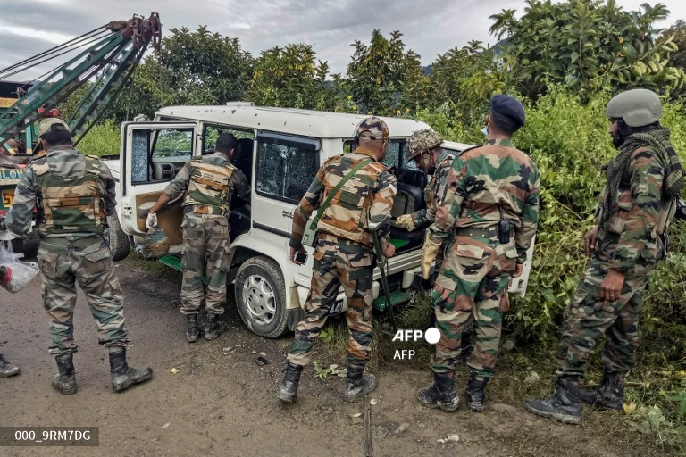 Indian army soldiers inspect a damaged vehicle at the site of an attack at Churachandpur on November 14, 2021, a day after seven soldiers including an Assam Rifles officer, his wife and son were killed in the attack. AFP