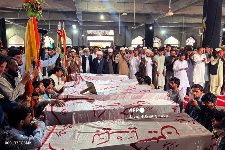 Pakistani Shiite Muslims offer funreal prayers around the coffins of victims killed in a school in the border town of Teri Mangal, during a funreal ceremony in Parachinar district on May 5, 2023, a day after eight people were killed in sectarian violence between the Shiite and Sunni communities, police said. Javid HUSSAIN / AFP