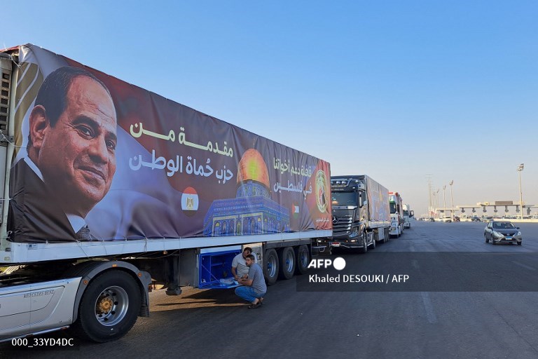 A convoy of trucks carrying aid supplies for Gaza from Egypt waits on the main Ismailia desert road, about 300 kms east of the Egyptian border with the Gaza Strip, on the way to the Rafah crossing on October 16, 2023. Portrait on the banner covering the truck shows Egypt's President Abdel Fattah al-Sisi, with the aid provided by an unaffiliated local political party. US Secretary of State Antony Blinken said while departing from Cair on October 15 the Rafah border crossing between Gaza and Egypt "will be open" for aid into the blockaded strip.Khaled DESOUKI / AFP