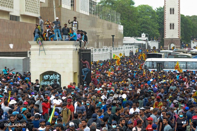 Protestors demanding the resignation of Sri Lanka's President Gotabaya Rajapaksa gather inside the compound of Sri Lanka's Presidential Palace in Colombo on July 9, 2022. Sri Lanka's beleaguered President Gotabaya Rajapaksa fled his official residence in Colombo, a top defence source told AFP, before protesters gathered to demand his resignation stormed the compound.