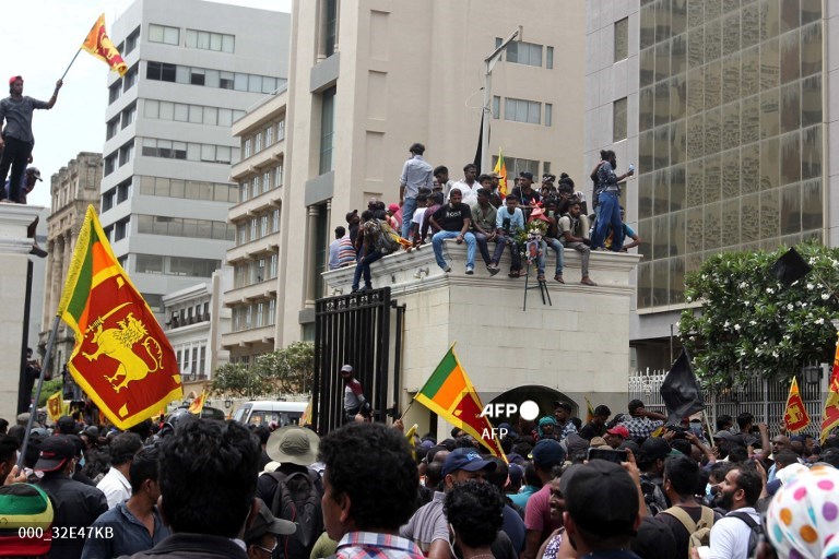 Protestors demanding the resignation of Sri Lanka's President Gotabaya Rajapaksa gather inside the compound of Sri Lanka's Presidential Palace in Colombo on July 9, 2022. Sri Lanka's beleaguered President Gotabaya Rajapaksa fled his official residence in Colombo, a top defence source told AFP, before protesters gathered to demand his resignation stormed the compound.