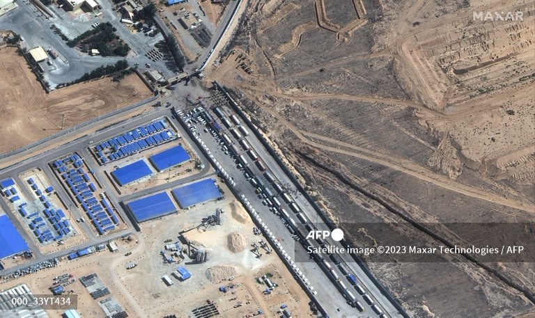 This handout satellite picture courtesy of Maxar Technologies taken on October 20, 2023, shows a closer view of humanitarian aid trucks waiting on the Egyptian side of the Rafah border crossing between northeastern Egypt and the southern Gaza Strip. Cargo planes and trucks have been bringing humanitarian aid to Rafah for days, but so far none has been delivered to Gaza which has been under intense Israeli bombardment for almost two weeks since the deadly October 7 attacks.Satellite image ©2023 Maxar Technologies / AFP
